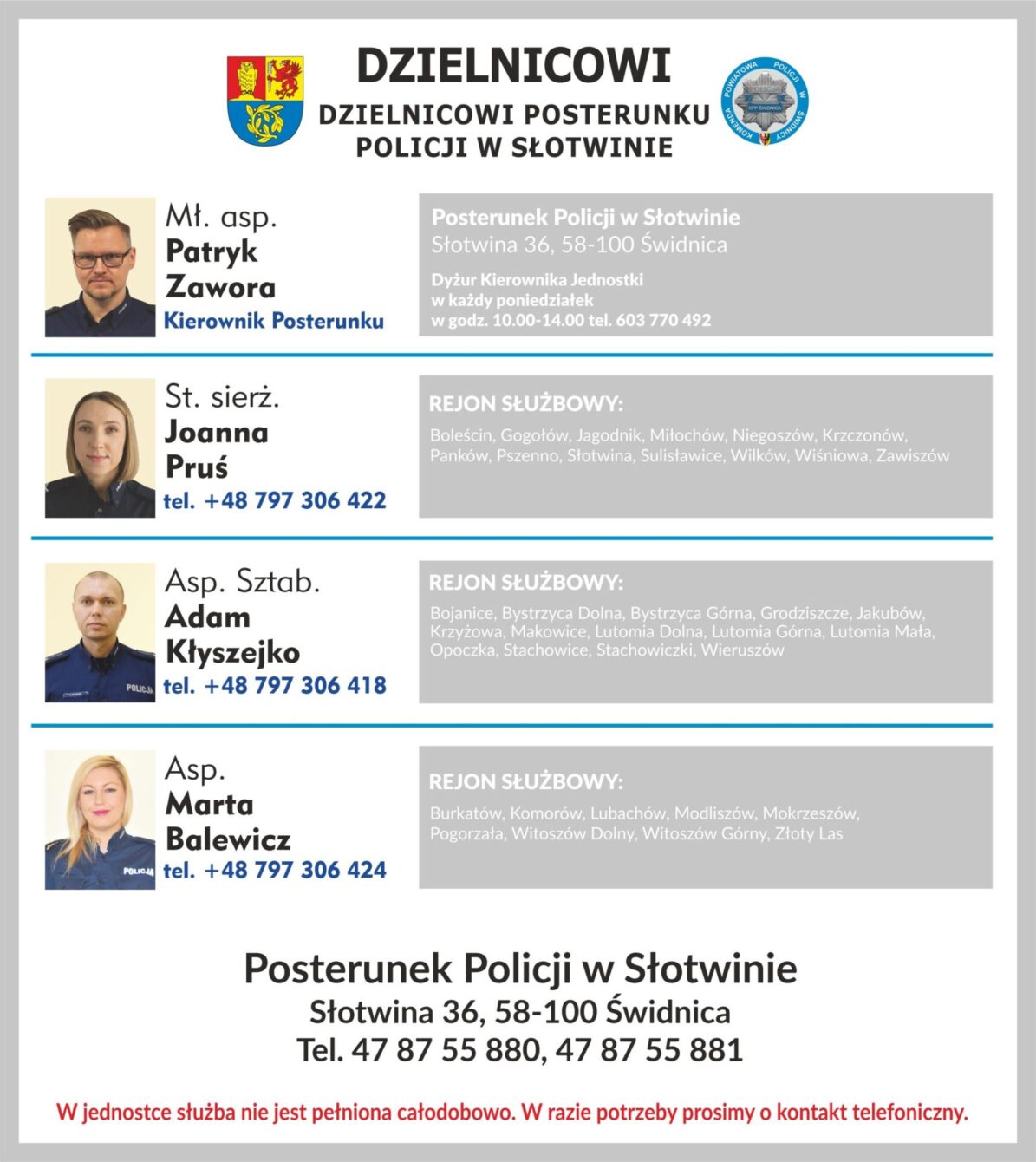Z dniem 15 stycznia nastąpiły zmiany kadrowe na stanowiskach kierowniczych w posterunkach Policji na terenie powiatu świdnickiego. Funkcję kierownika Posterunku Policji w Słotwinie objął mł. asp. Patryk Zawora. Dotychczasowy kierownik posterunku, asp. szt. Tomasz Zdeb, został powołany na stanowisko kierownika Posterunku Policji w gminie Marcinowice.